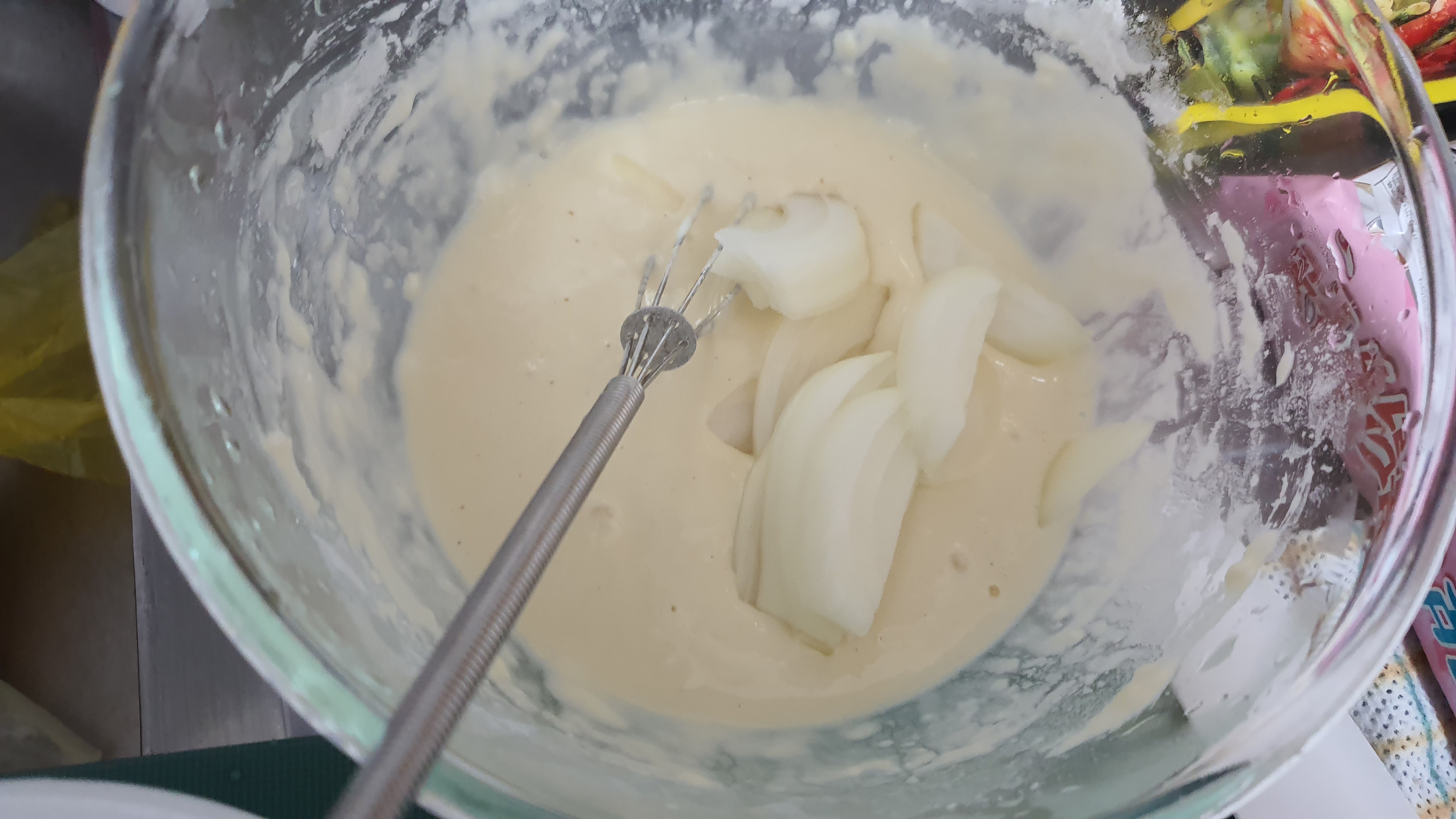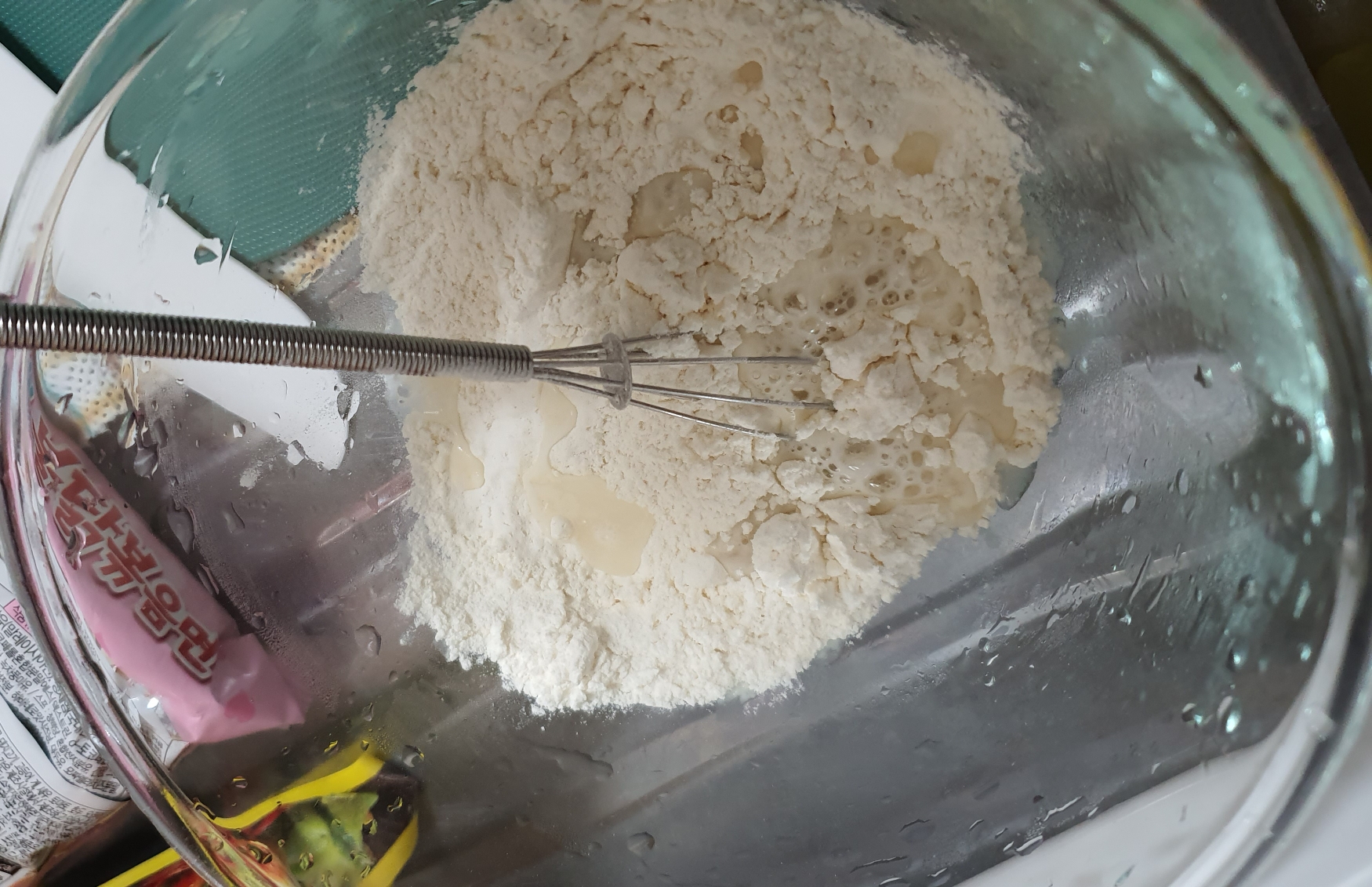 부침가루에 물을 조금씩, 조금씩 조절하면서 넣어줍니다.물을 넣고 바로 휘리릭섞어줘야 덩어리가 안 생겨요~