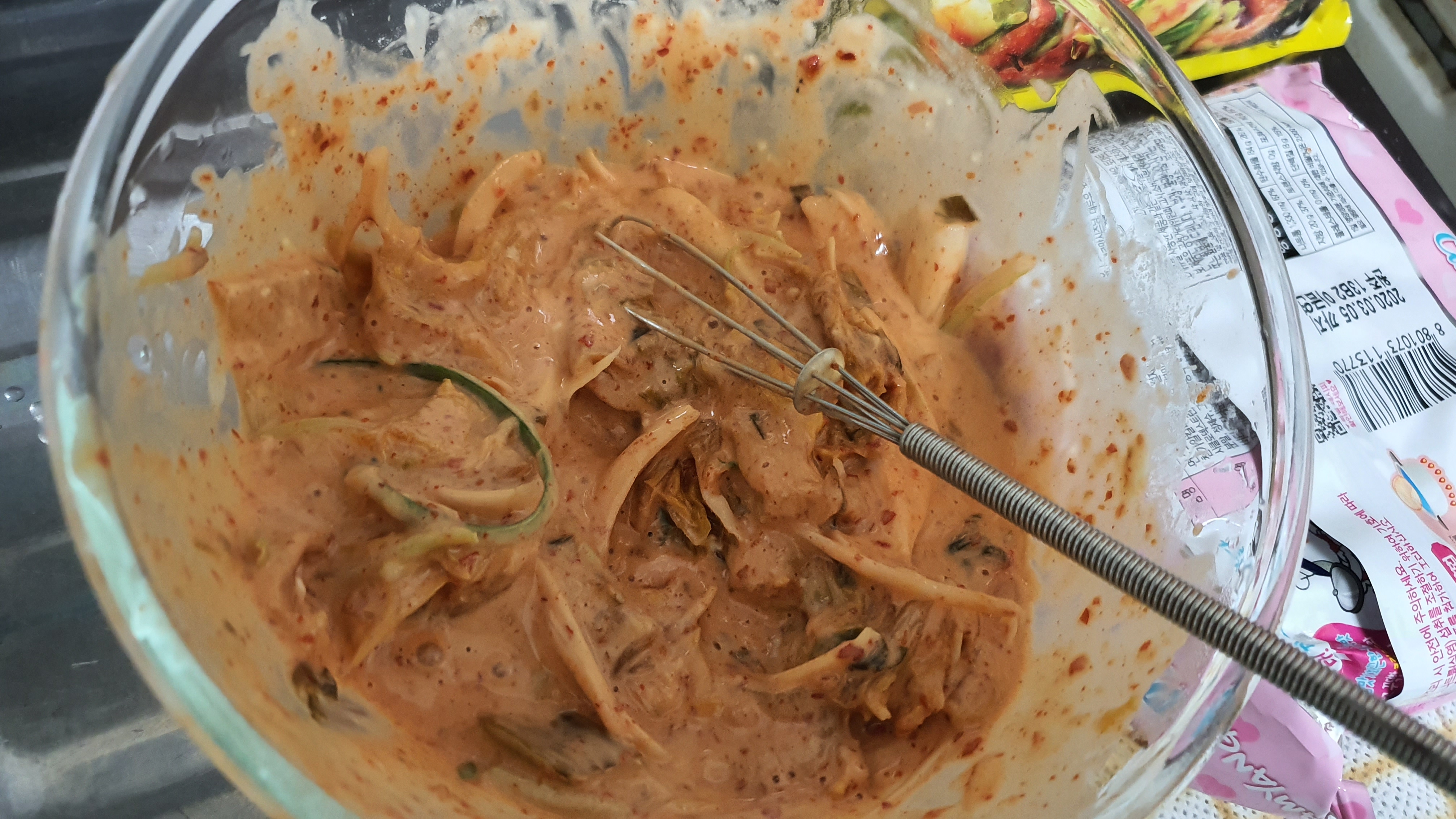 재료들이 모두 다 들어갔어요!! 다들 섞어줍니다. 혹시 반죽 색을 보면서 연하다 싶으면 김치국물을 넣어주세요ㅎ 싱겁잖아요~